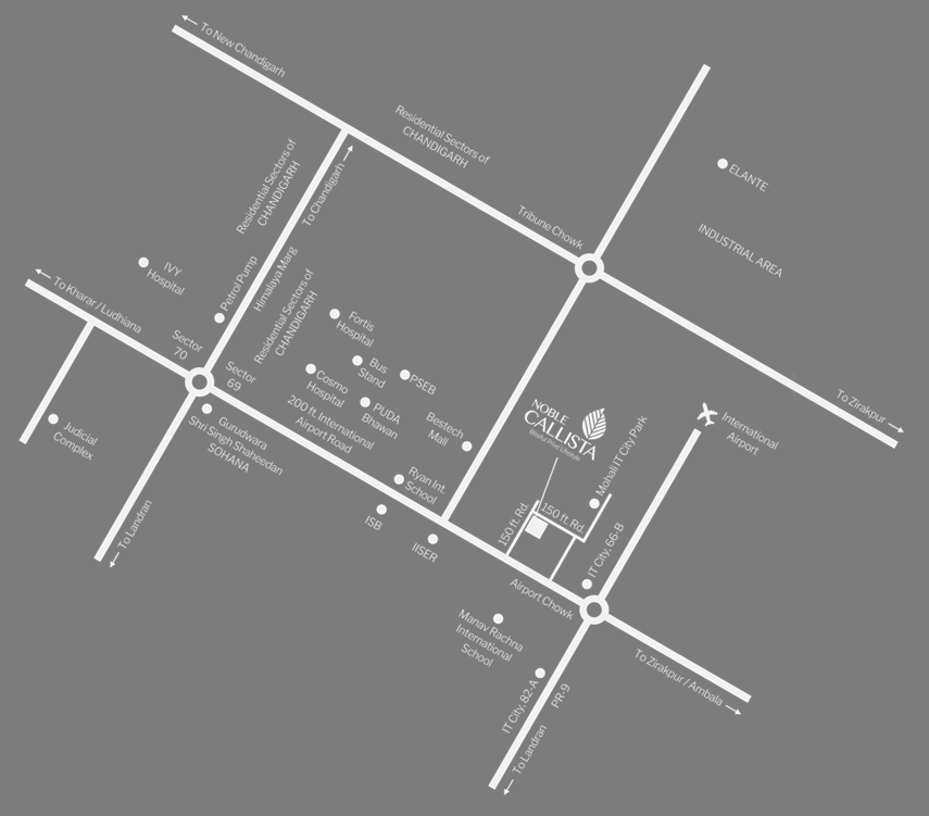 Everyone wants a nice, comfortable, luxurious lifestyle away from the bustle of the city. Yet, home buyers look for a house that keeps them connected to all the major hotspots such as offices, schools, hospitals, shopping centres and more. As Noble Callista was conceptualized to offer the utmost convenience to the dwellers, the location of the project was also carefully selected. Sector 66, Mohali is a calm and budding suburb and lies directly on the International Airport Road. The road will keep you connected to the major destinations and when you drive back home, you will be nestled in the calmness of nature.